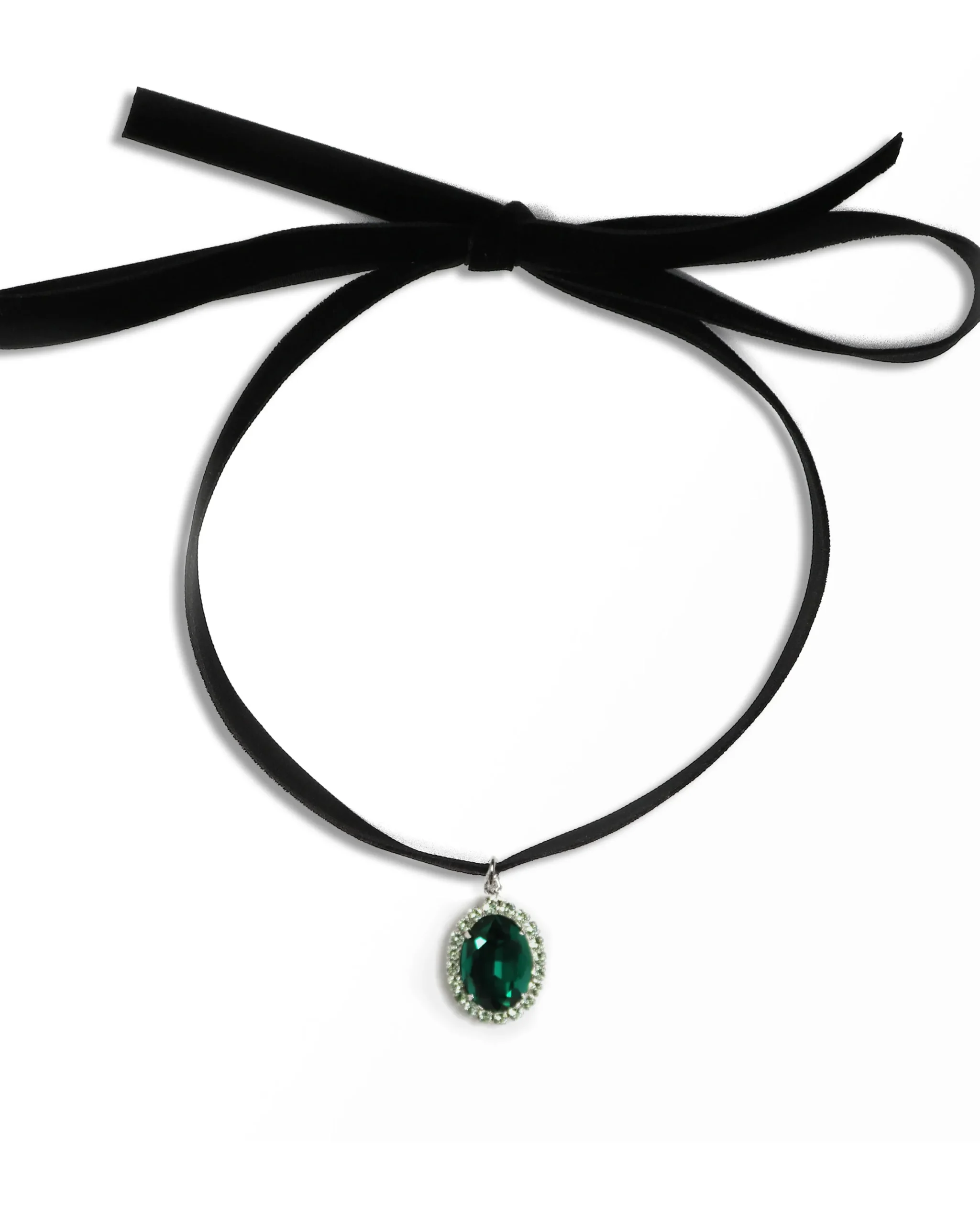 Materials: Rhodium plated brass, Swarovski crystal, velvet ribbon