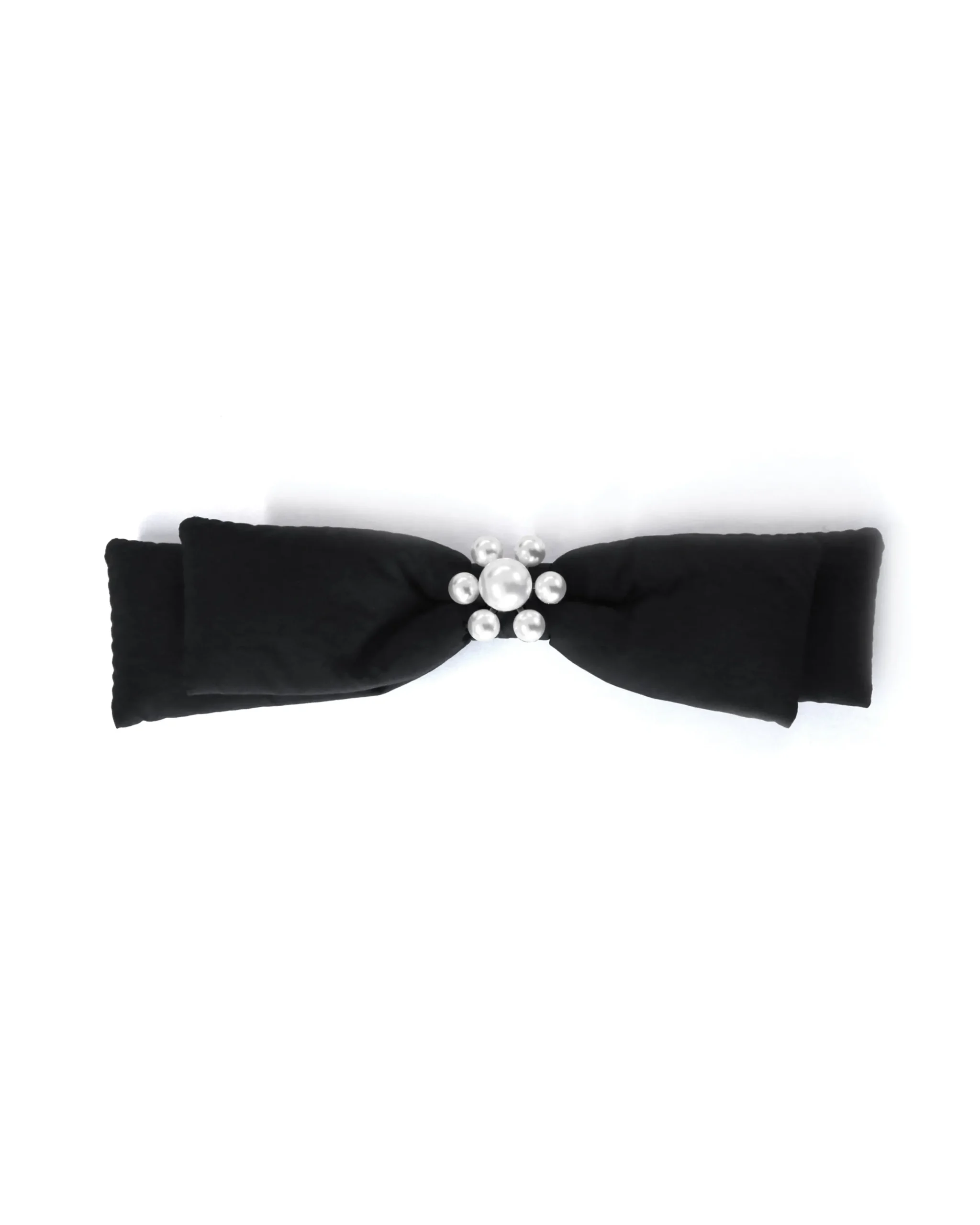 Materials: Rhodium plated brass, Swarovski faux pearl, Polyester bow