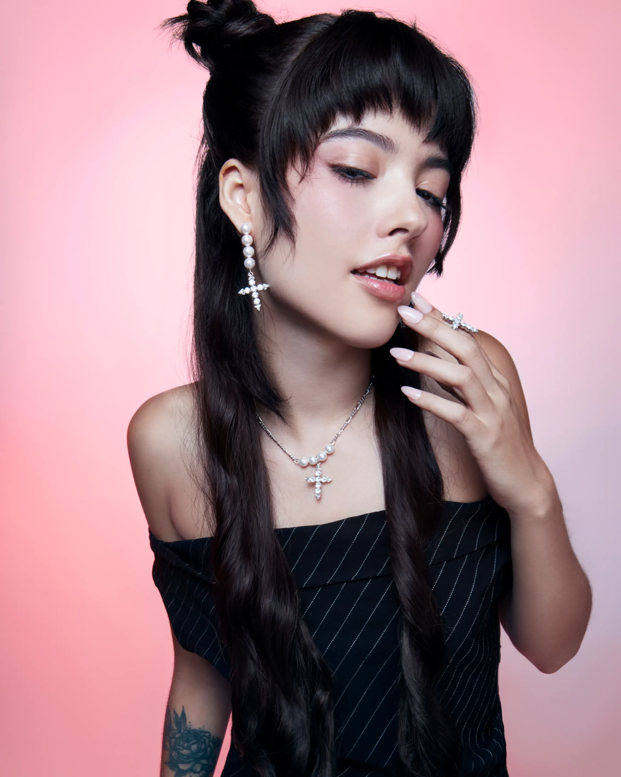 Materials: Rhodium plated brass, Swarovski crystal, Swarovski faux pearl