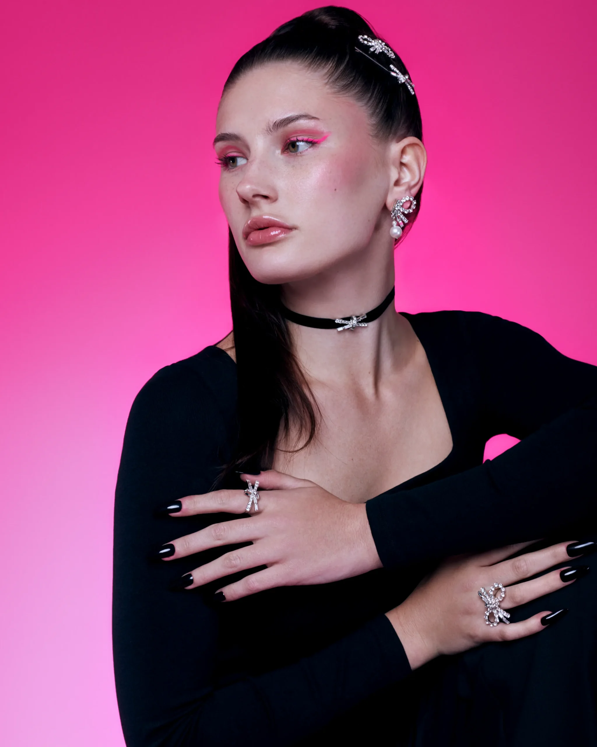Materials: Rhodium plated brass, Swarovski crystal, Swarovski faux pearl