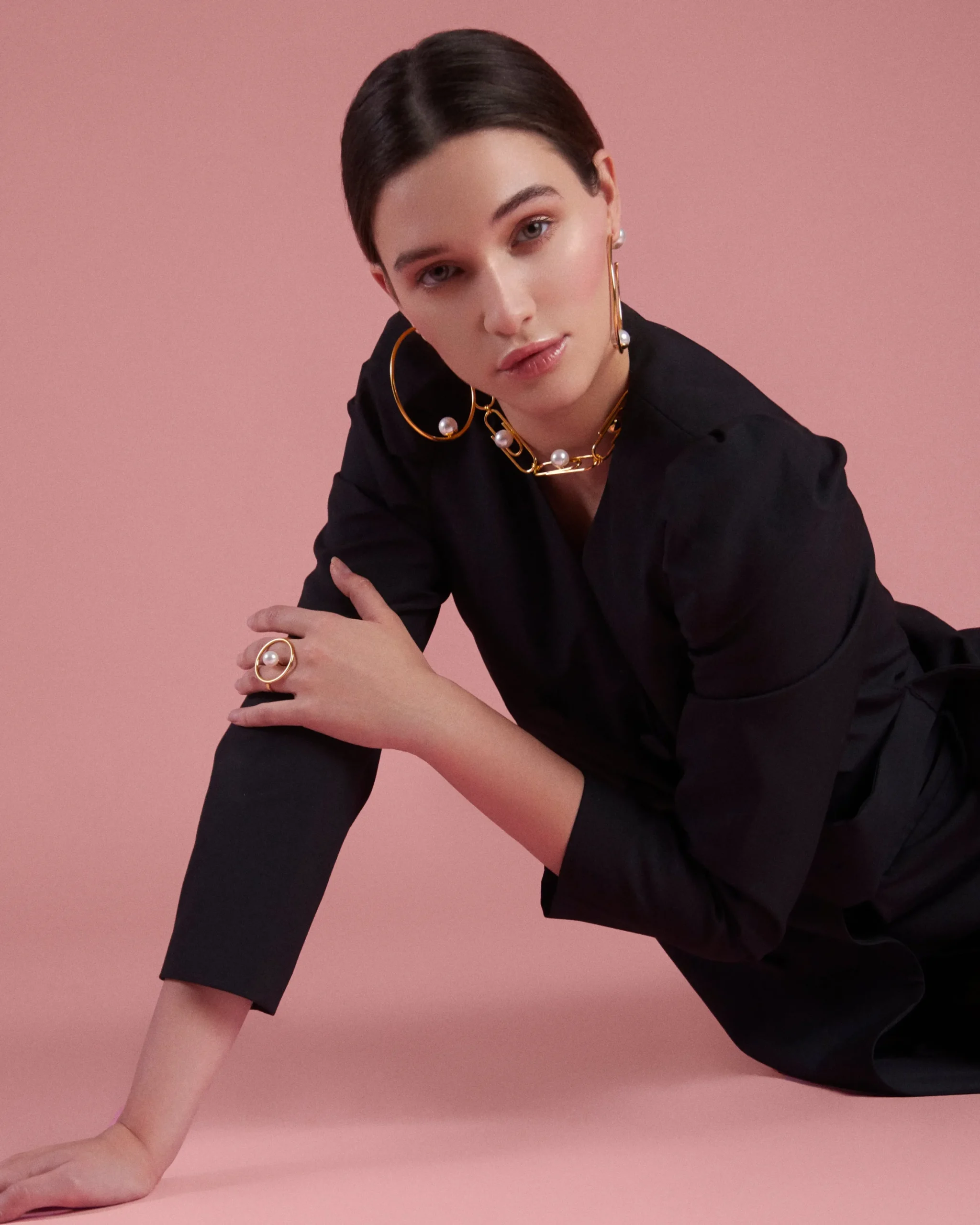 Materials: 24k gold plated brass, 12mm Swarovski faux pearl, 16mm faux pearl back
