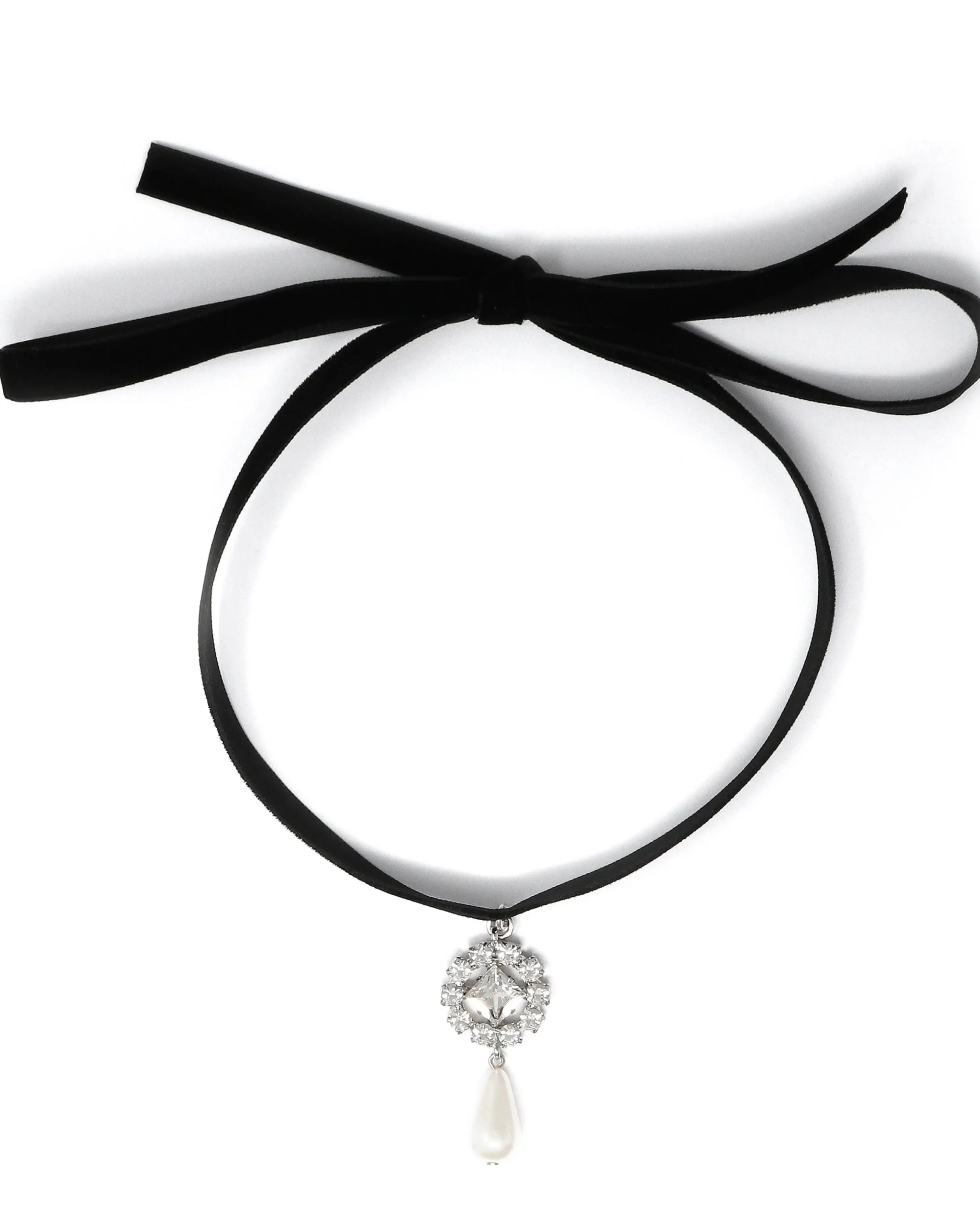 Materials: Rhodium plated brass, Swarovski crystal, 18mm Japanese faux pearl, velvet ribbon