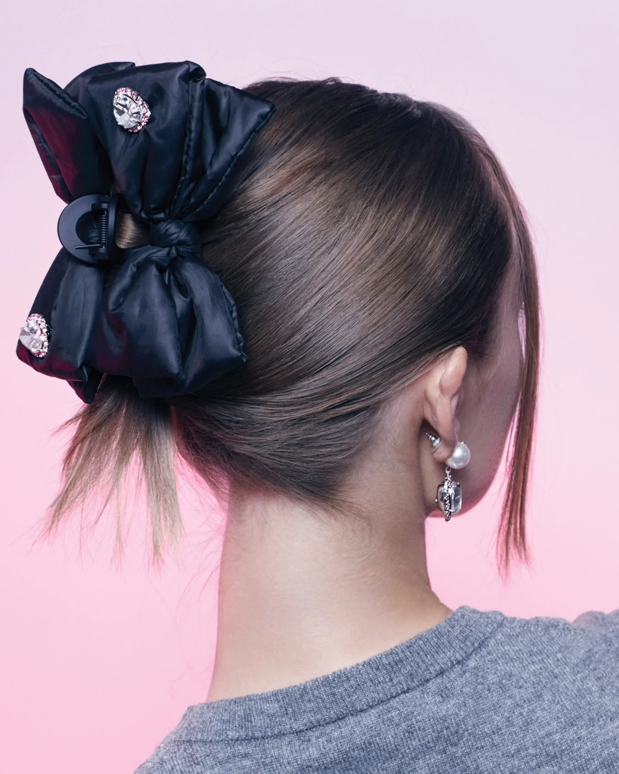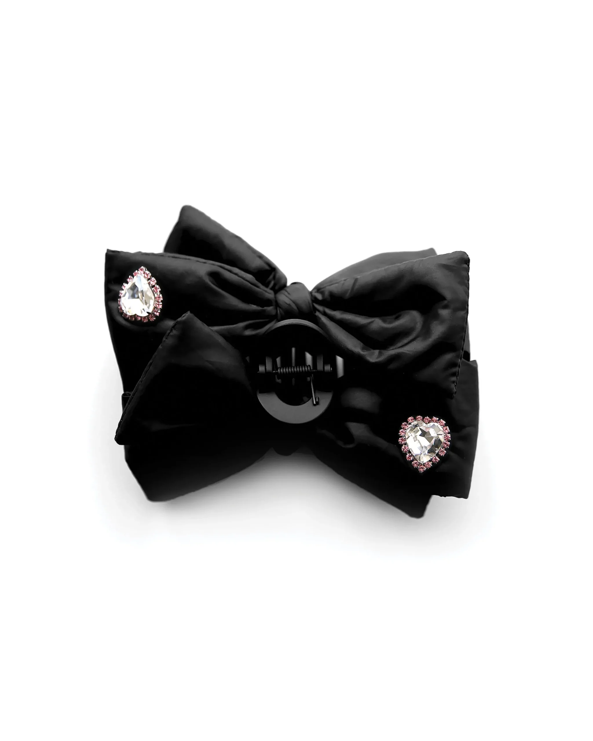 Materials: Rhodium plated brass, Swarovski crystal, Polyester bow, Acrylic hair claw