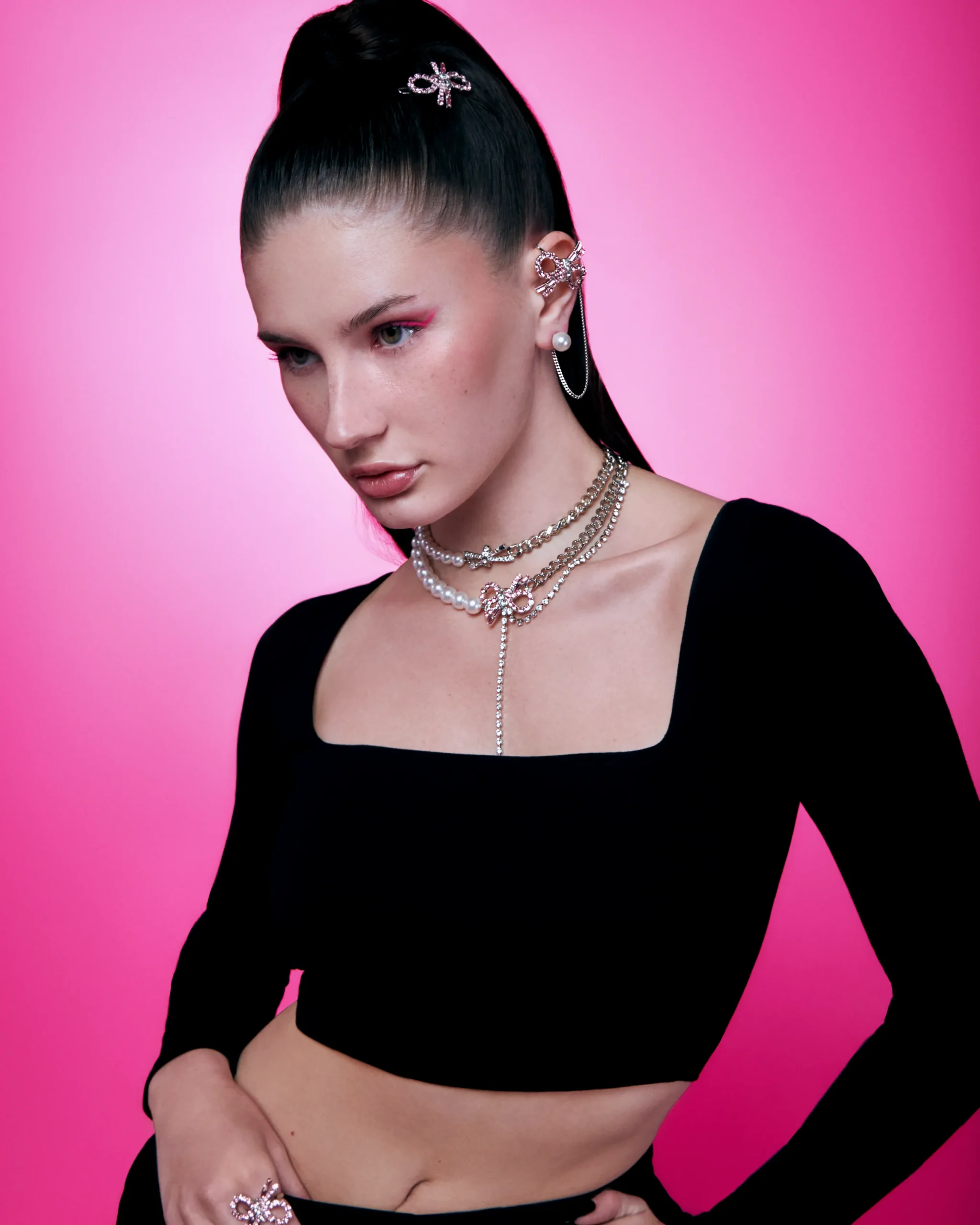 Materials: Rhodium plated brass, Swarovski crystal, Swarovski faux pearl