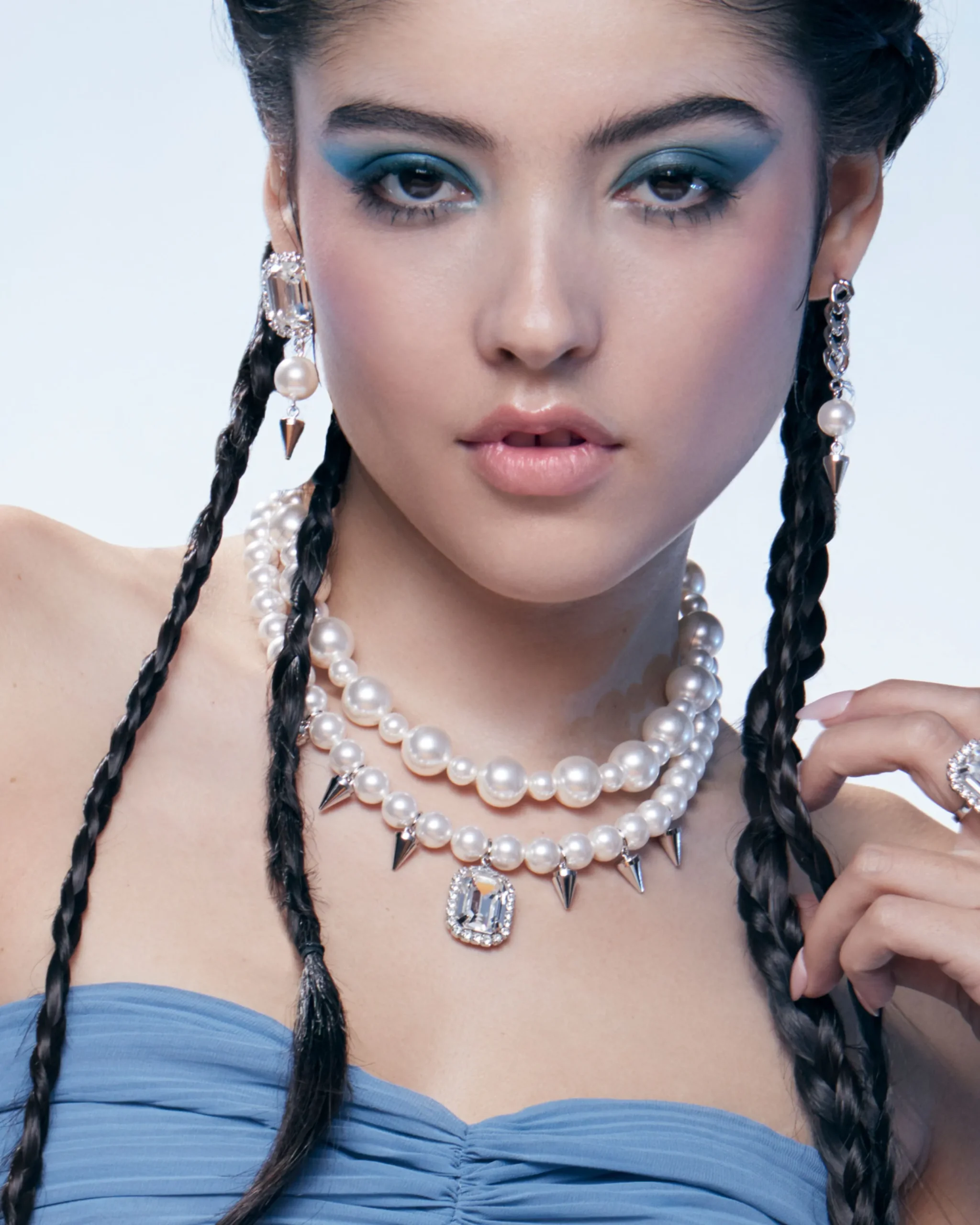 Materials: Rhodium plated brass, Swarovski crystal, Swarovski faux pearl